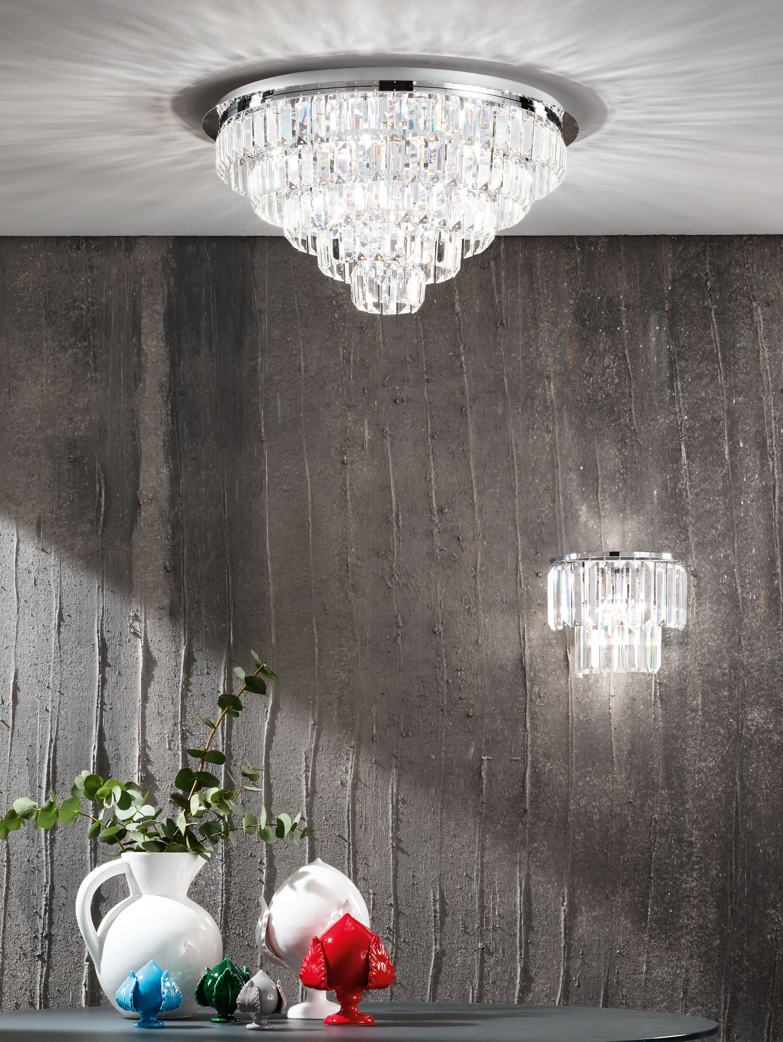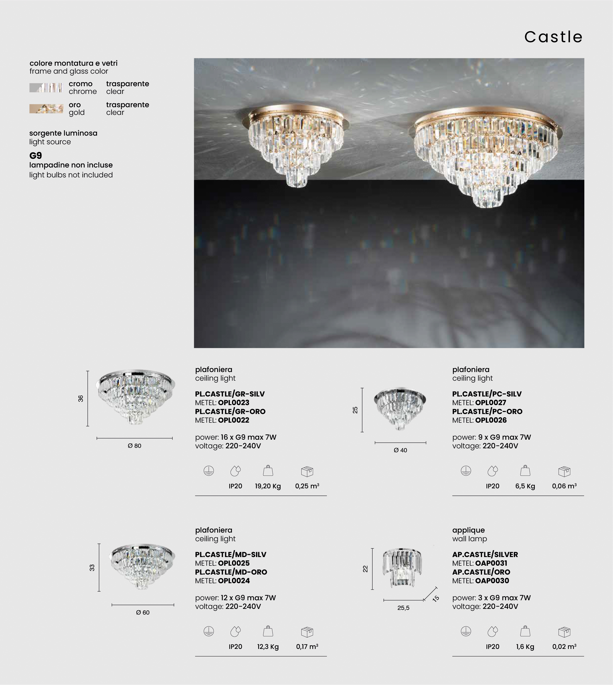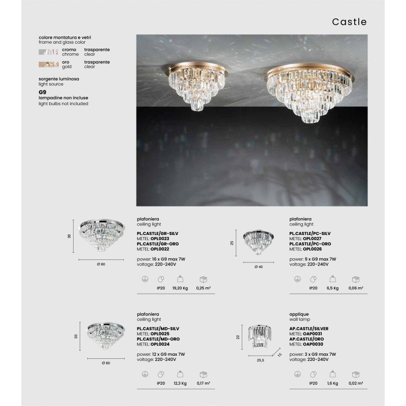 Collezione con struttura metallica ed elementi in cristallo, disponibile in due varianti di colore, Cromo trasparente e Oro trasparente.